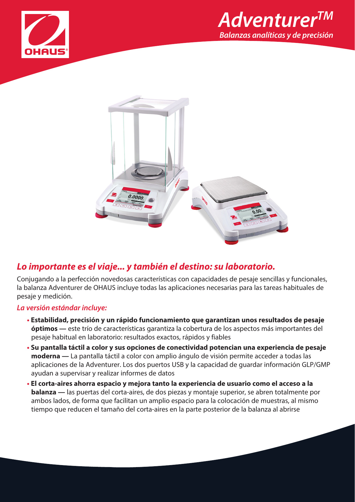 Al alcanzar el equilibrio ideal entre características inventivas y capacidades de pesaje funcionales y sencillas, el Ohaus Adventurer incorpora todas las aplicaciones necesarias para el pesaje de rutina y las actividades de medición.