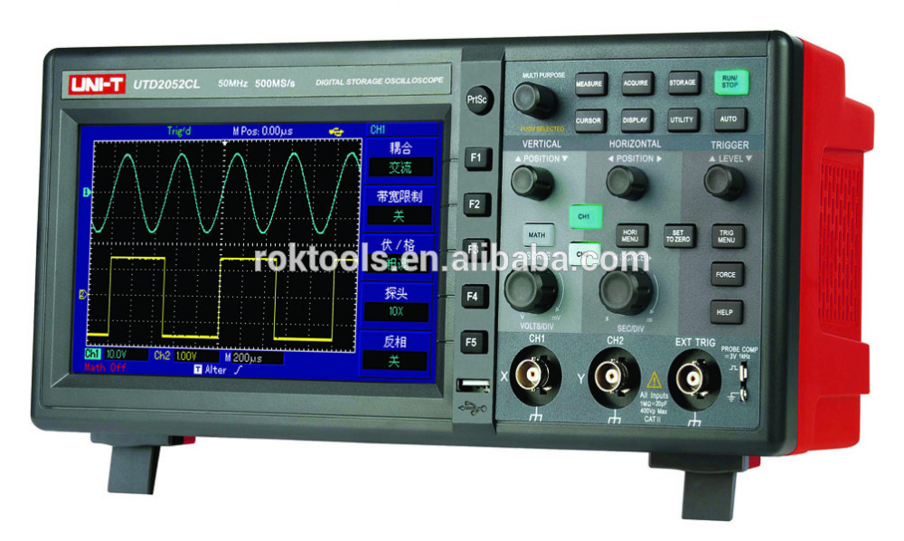El osciloscopio UTD2052CEL (UTD2052CEL) lanzado en 2010. Es un osciloscopio DSO. El osciloscopio de almacenamiento digital (DSO) es el tipo preferido para la mayoría de las aplicaciones industriales. En lugar de tubos de rayos catódicos de tipo de almacenamiento, los DSO utilizan memoria digital, que puede almacenar datos todo el tiempo que sea necesario sin degradación. Un osciloscopio de almacenamiento digital también permite el procesamiento complejo de la señal mediante circuitos de procesamiento de señal digital de alta velocidad.